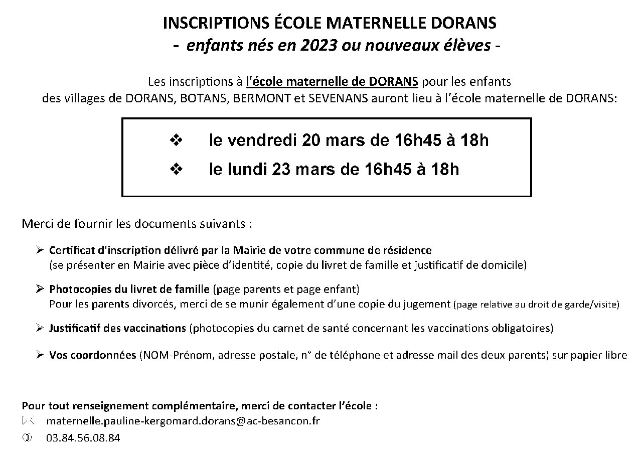 Les inscriptions à l'école maternelle de Dorans pour les enfants des villages de Dorans, Botans, Bermont et Sevenans auront lieu :