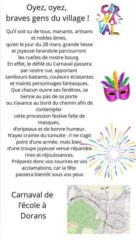 En raison du carnaval des écoles organisé par l'association Les P'tits Coups Deux Mains le samedi 28 mars 2026, de 9h à 12h, un arrêté municipal signale que la circulation sera interdite durant le passage du cortège dans les rues de la Chapelle, de la Charme, des Sapins, des Écoles et du Tilleul. Vous trouverez l'arrêté municipal en pièce jointe.