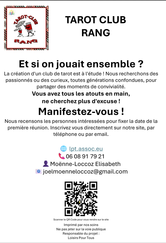 La création d'un club de tarot est à l'étude. Les personnes intéressées peuvent nous contacter via le site, par téléphone ou par mail